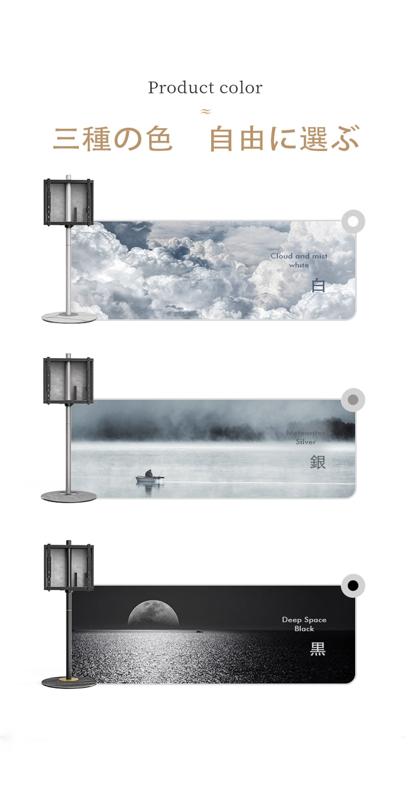- ユニークなデザイン:マスターシリーズのテレビスタンドは、大理石柄の円形ベースと上品な柱が特徴です。シンプルで高級感のあるデザインは、目を引きます。