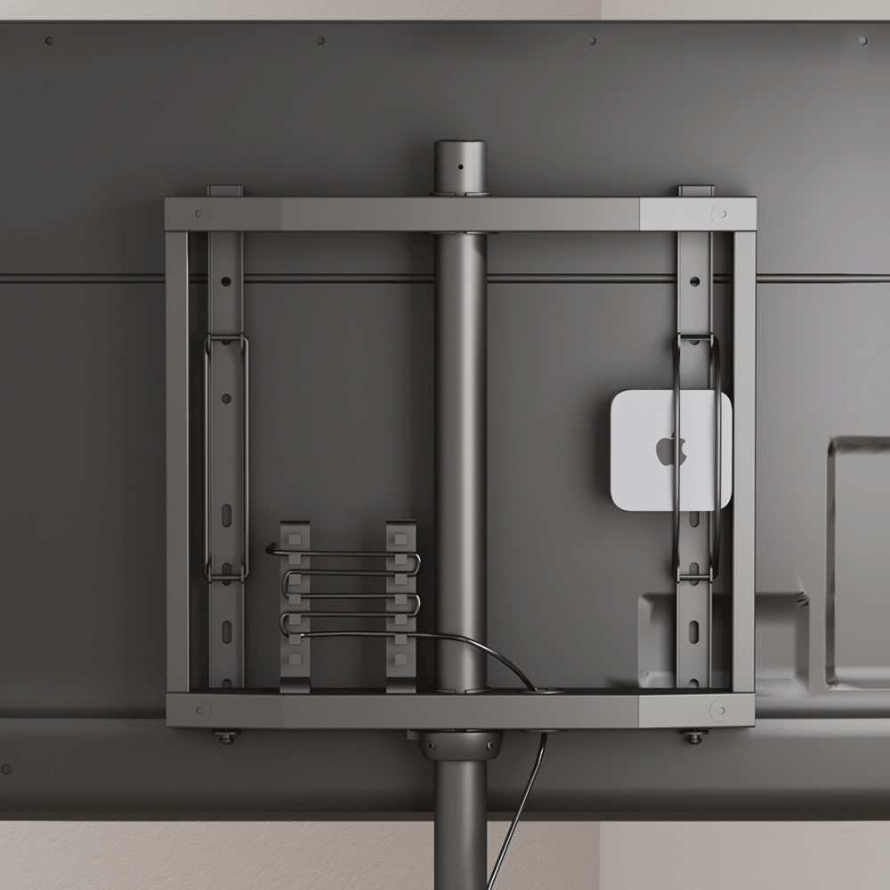 支柱内で隠れ式配線収納とかつてない背面で隠れ式小物収納併有。