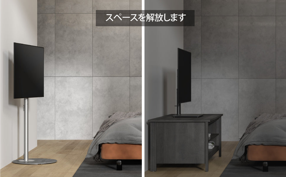 - 省スペース設計、角に設置可能:マスターシリーズのテレビスタンドは、スペースを有効に活用するためのコンパクトなデザインが特徴です。円形ベースは角に完璧にフィットし、部屋を整理整頓し広々と感じさせます。